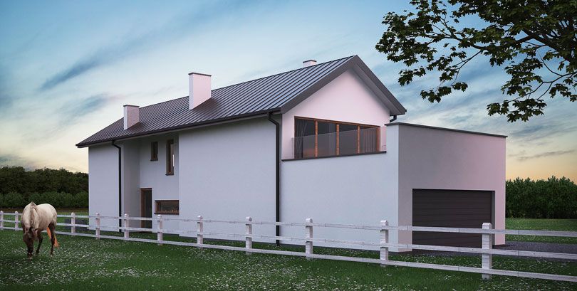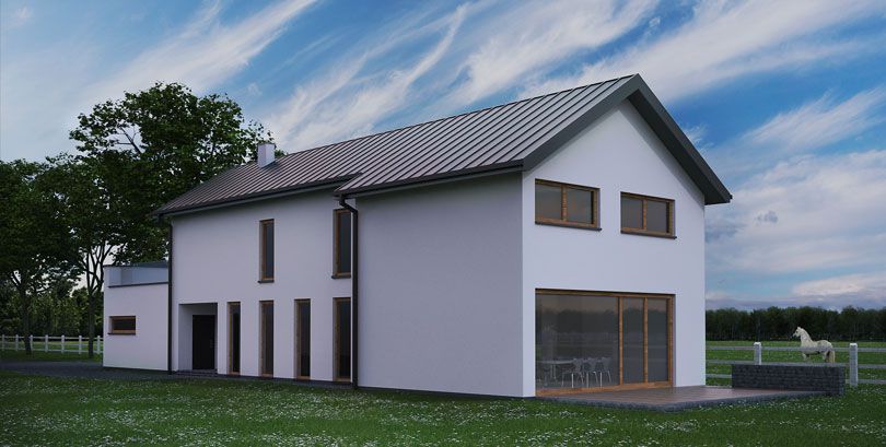 Dom jednorodzinny na bardzo wąskiej działce o szerokości 16,5m. Nowoczesna bryła z tradycyjnym nawiązaniem do otoczenia.