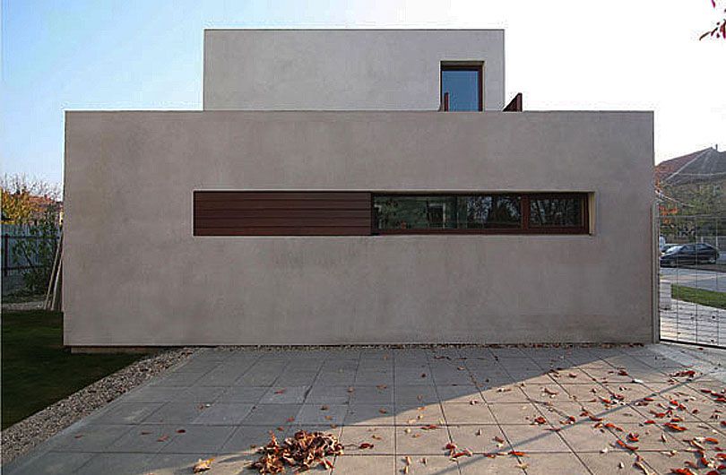 Projekt nowoczesnego domu jednorodzinnego w modernistycznej bryle na stosunkowo niewielkiej działce miejskiej.