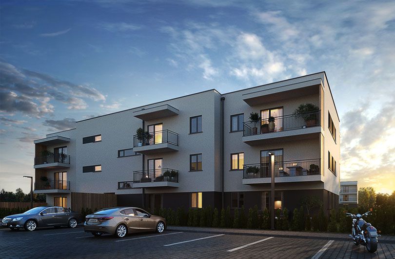 Projekt kameralnego osiedla 3 budynków mieszkalnych wielorodzinnych na obrzeżach Płocka.